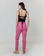 Calça da marca Andrea Bogosian, confeccionada em couro na cor rosa. Possui modelagem justa com cintura alta, recorte central frontal e bolso aplicado na parte de trás. A peça apresenta fechamento por zíper metálico na parte posterior