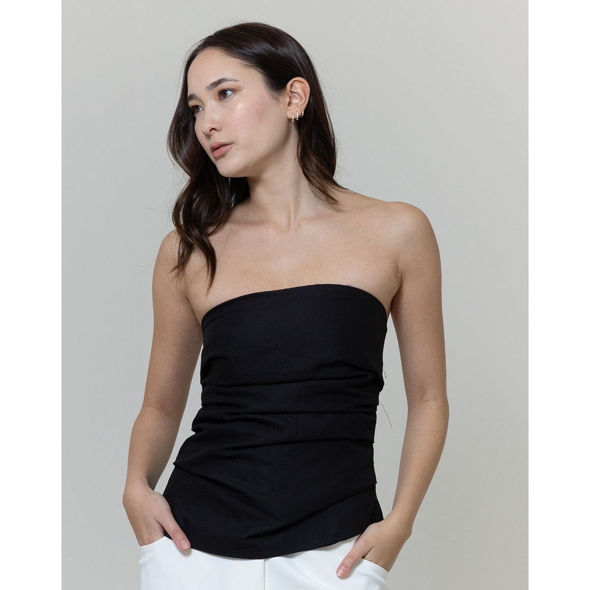 Blusa preta tomara que caia com modelagem ajustada e drapeado frontal. Costas lisas e comprimento na altura dos quadris.