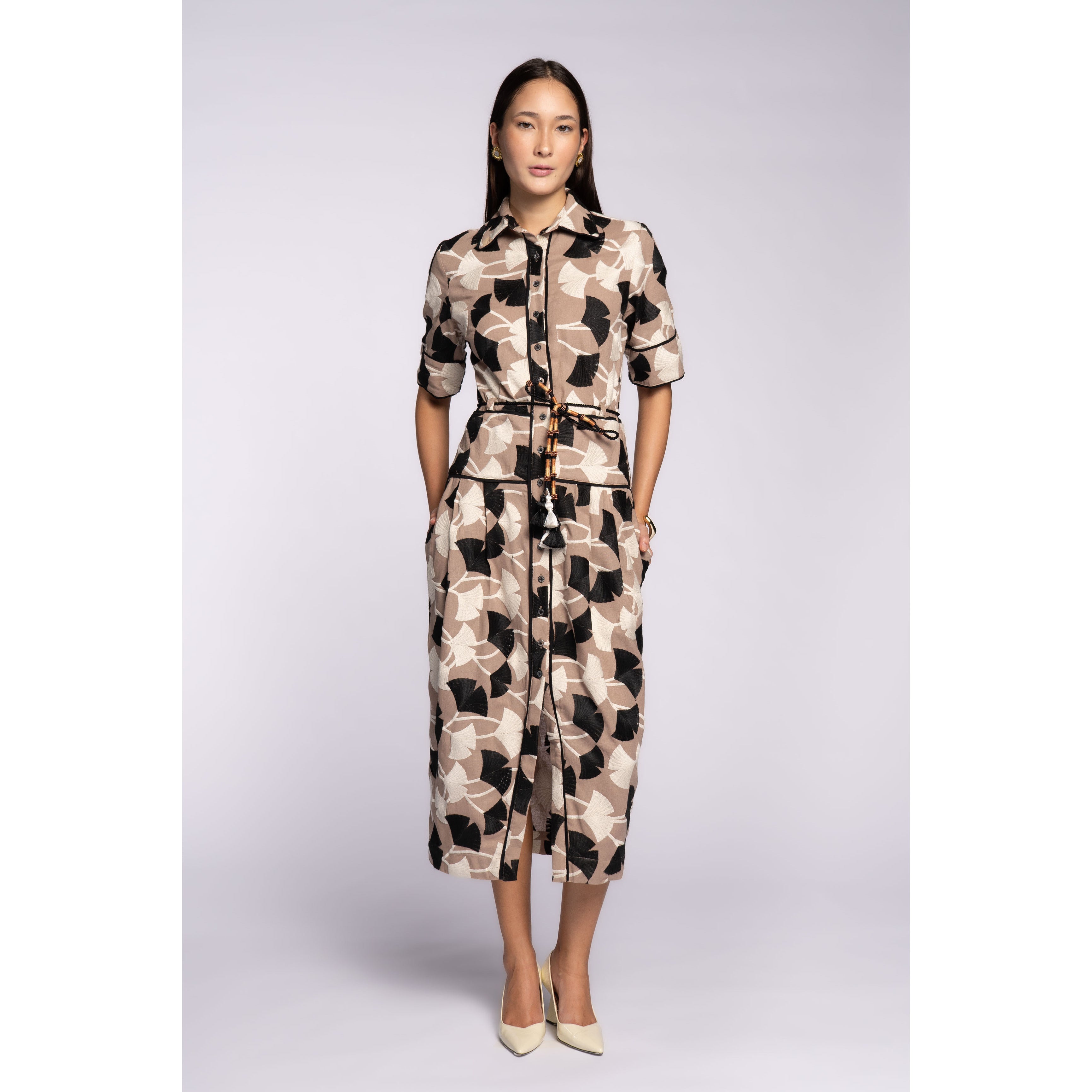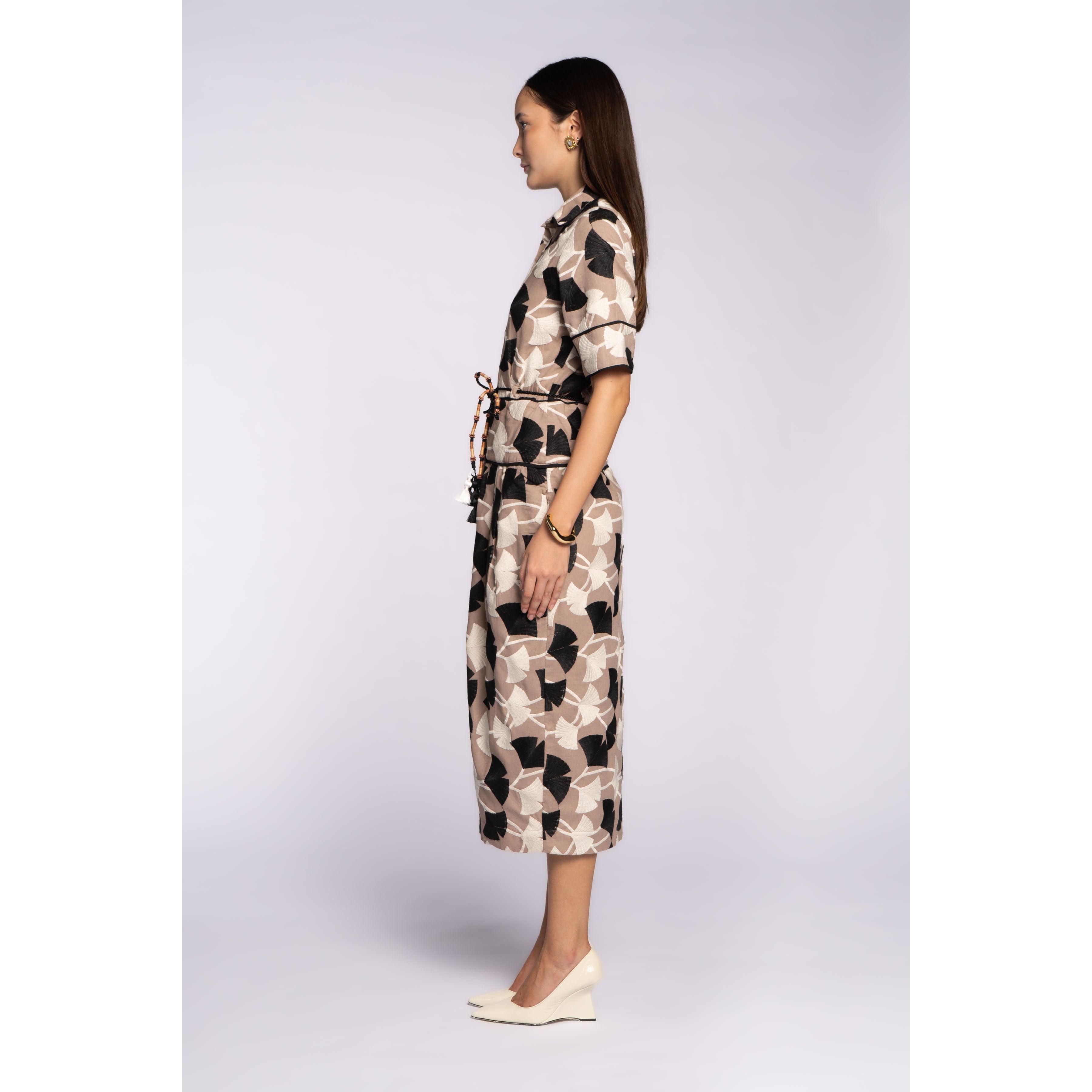 Vestido midi estilo chemise com mangas curtas em tecido natural bordado. A peça possui uma faixa larga na cintura, modelagem reta e fechamento frontal com botões de madrepérola. Acompanha um cinto estilo cordão com detalhes manuais nas pontas.
