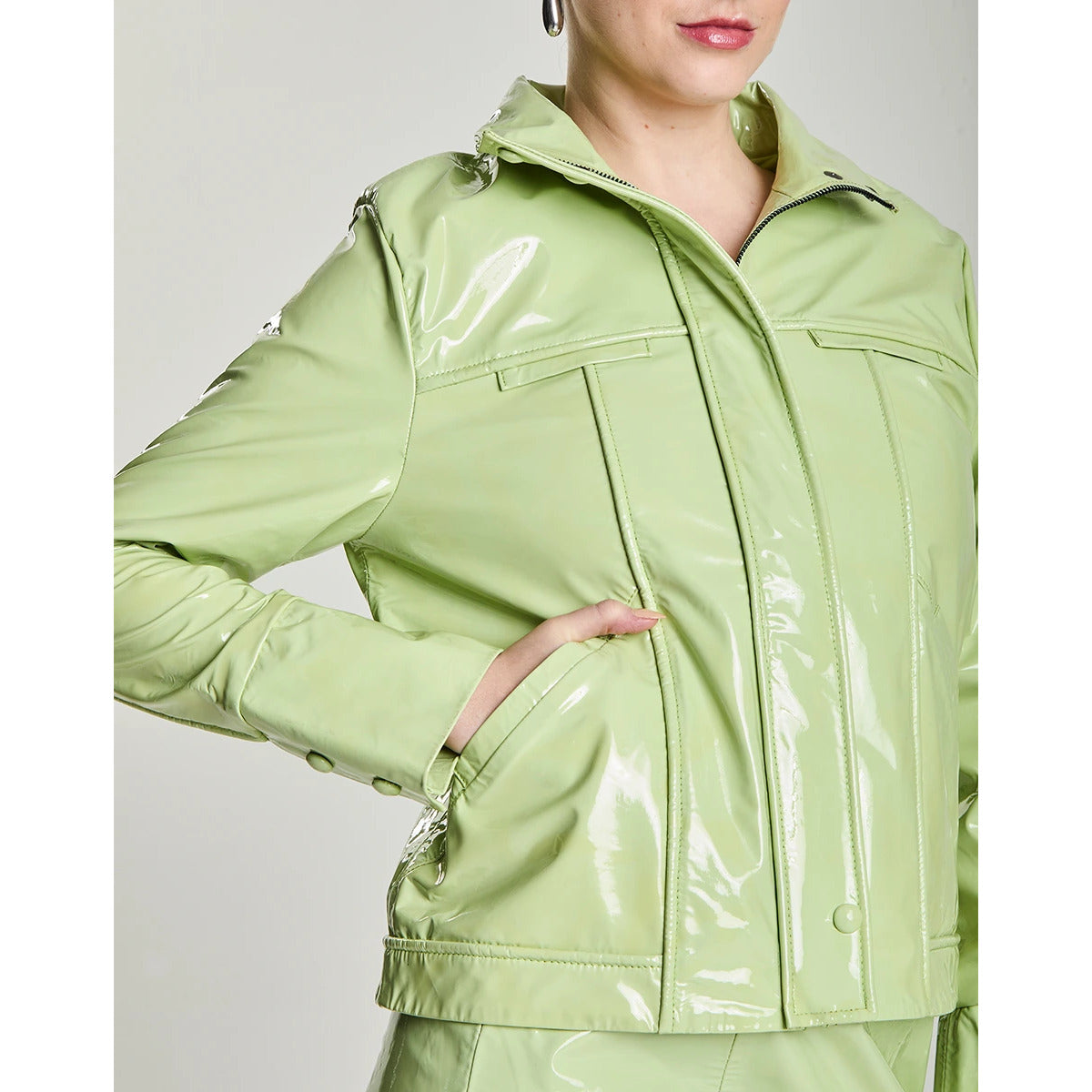 Jaqueta verde-claro com acabamento em couro verniz. Possui gola tradicional, recortes frontais curvos e mangas longas com barra reta. Fechamento frontal com zíper oculto por aba.
