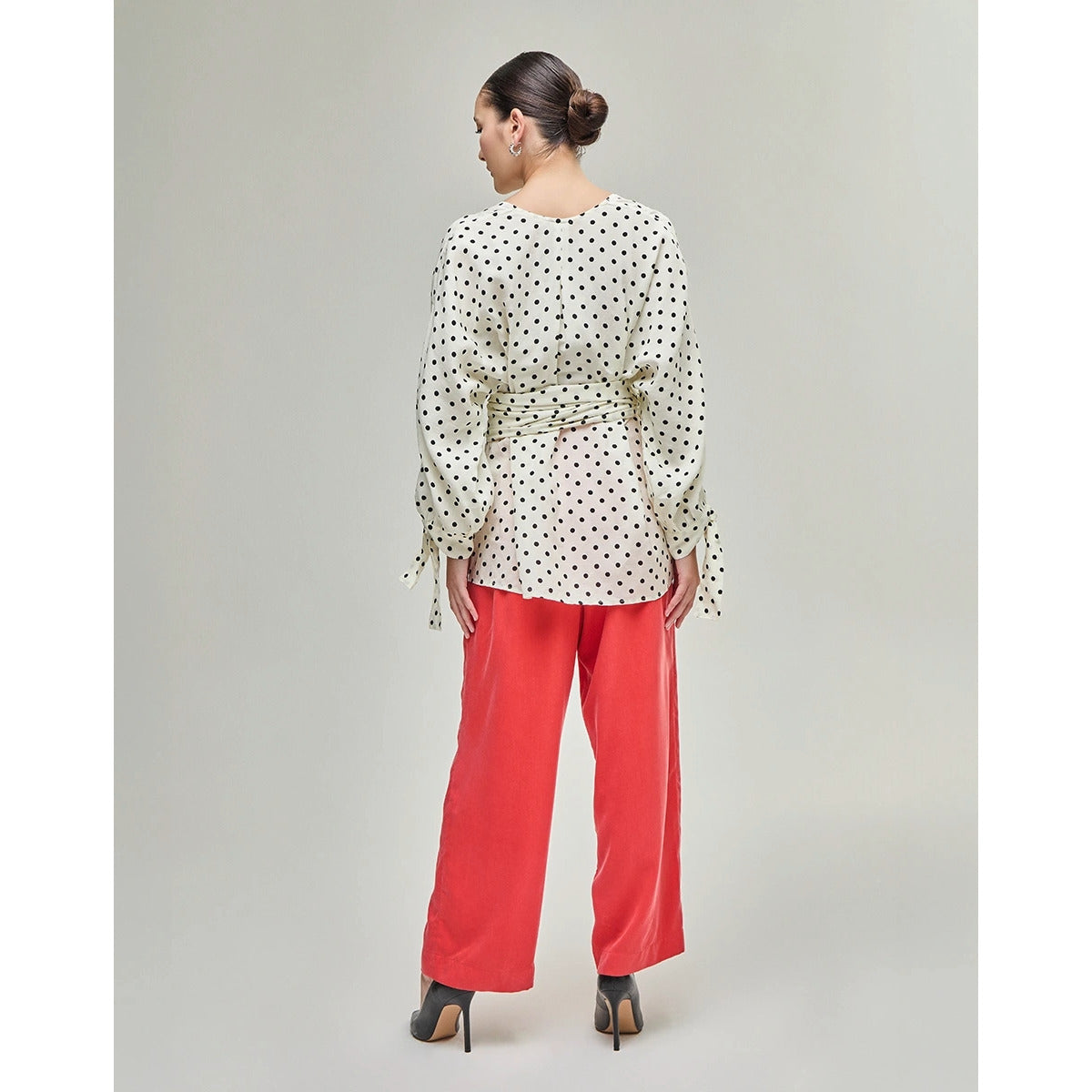 Kimono off-white com estampa de poás pretos. Possui modelagem ampla, mangas longas com volume e amarração nos punhos. Apresenta decote em V transpassado com faixa larga para amarração na cintura e comprimento abaixo do quadril.