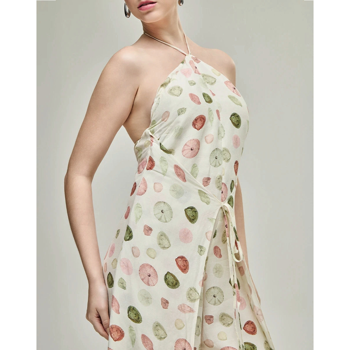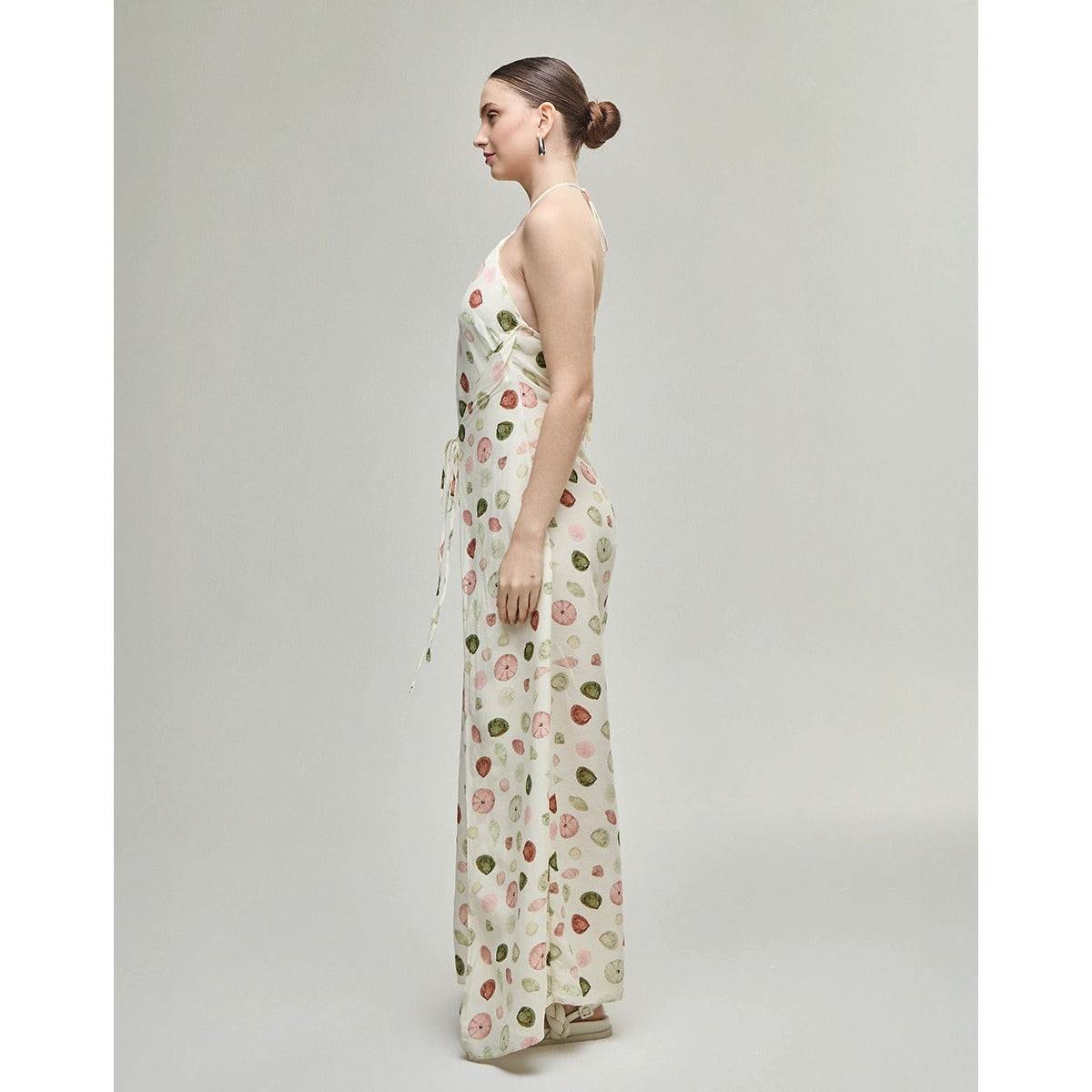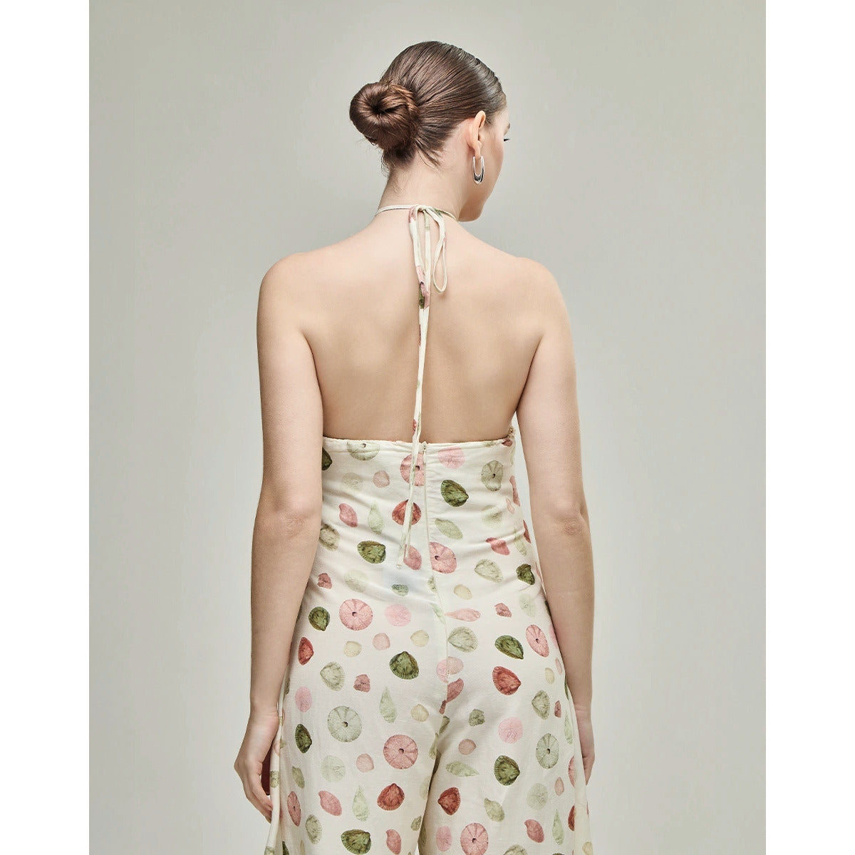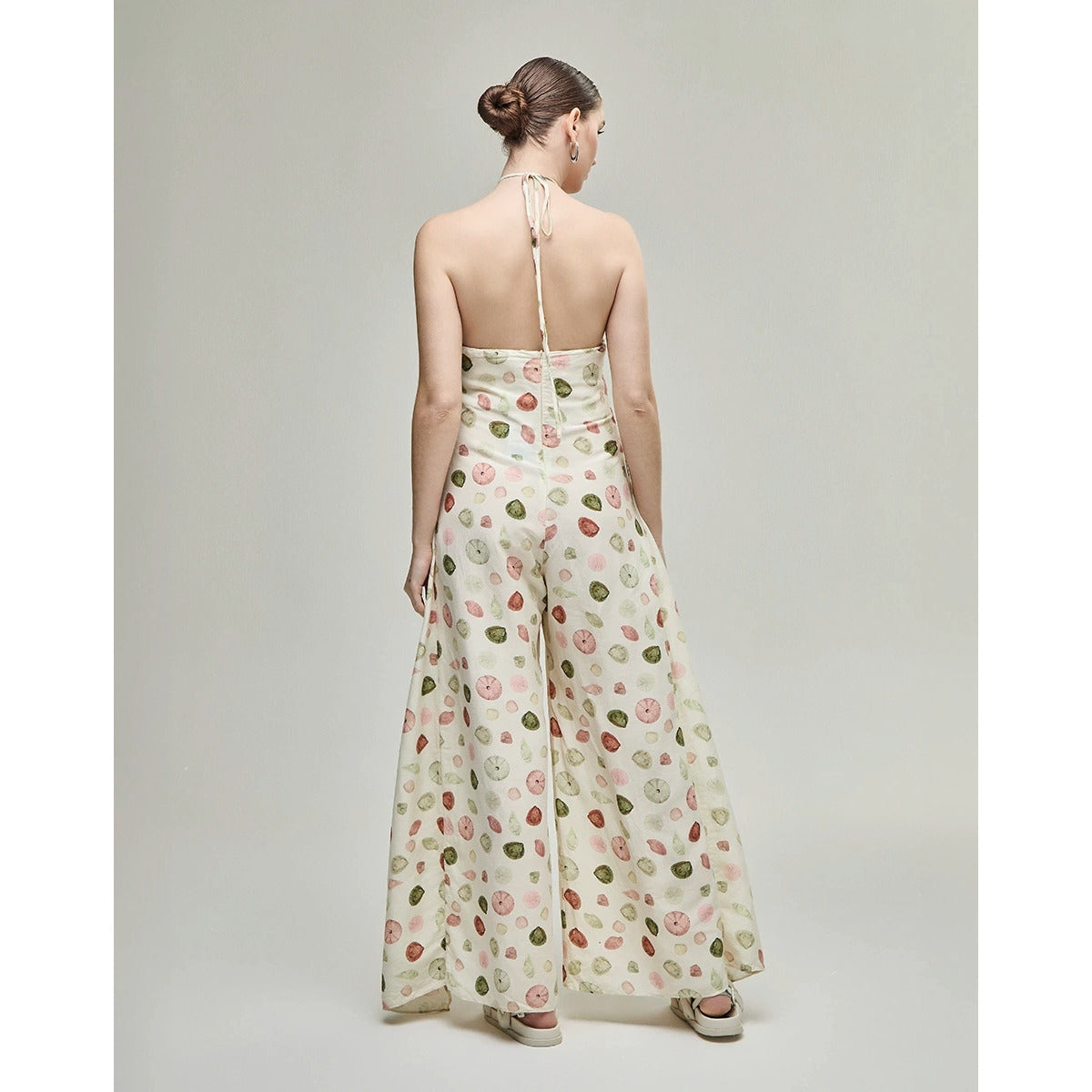 Macacão off-white com estampa de conchas em tons de verde, rosa e terracota. Modelagem ampla com perna reta e longa. Decote halter com alças finas para amarração no pescoço. Recorte frontal transpassado com amarração na cintura.