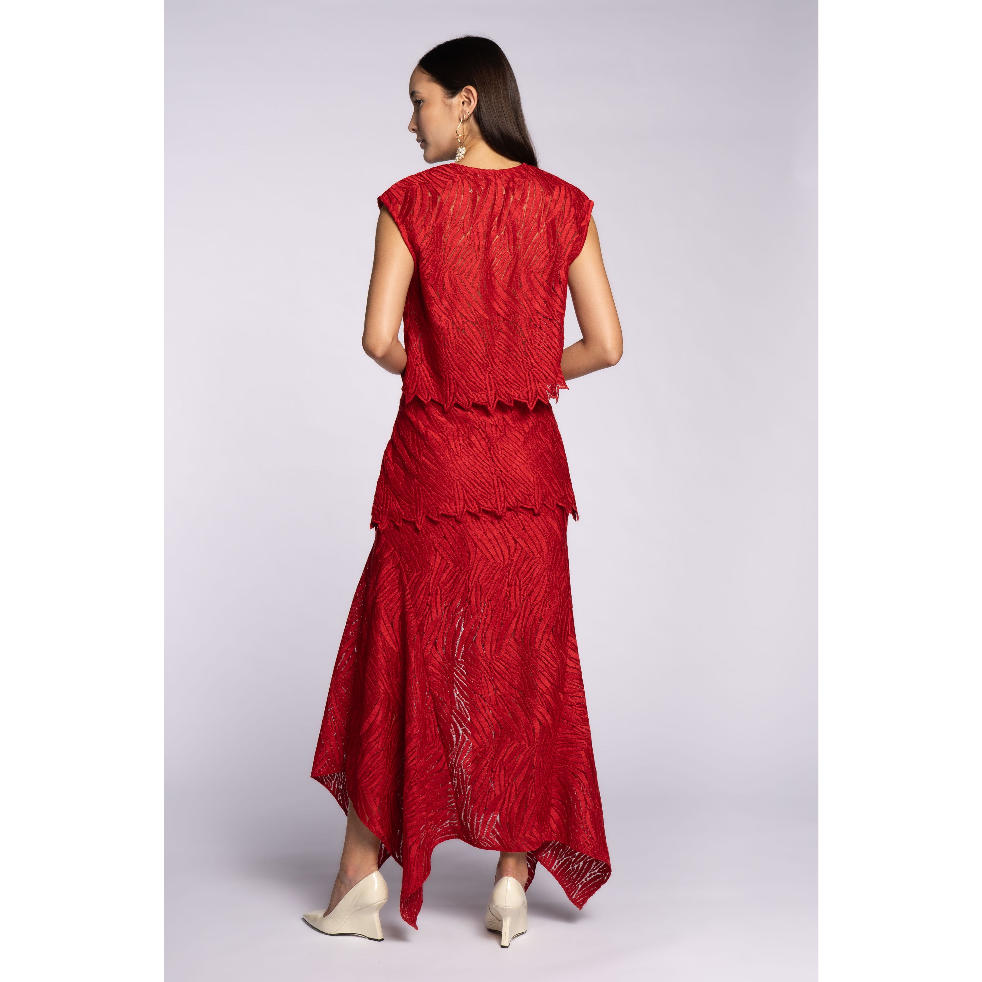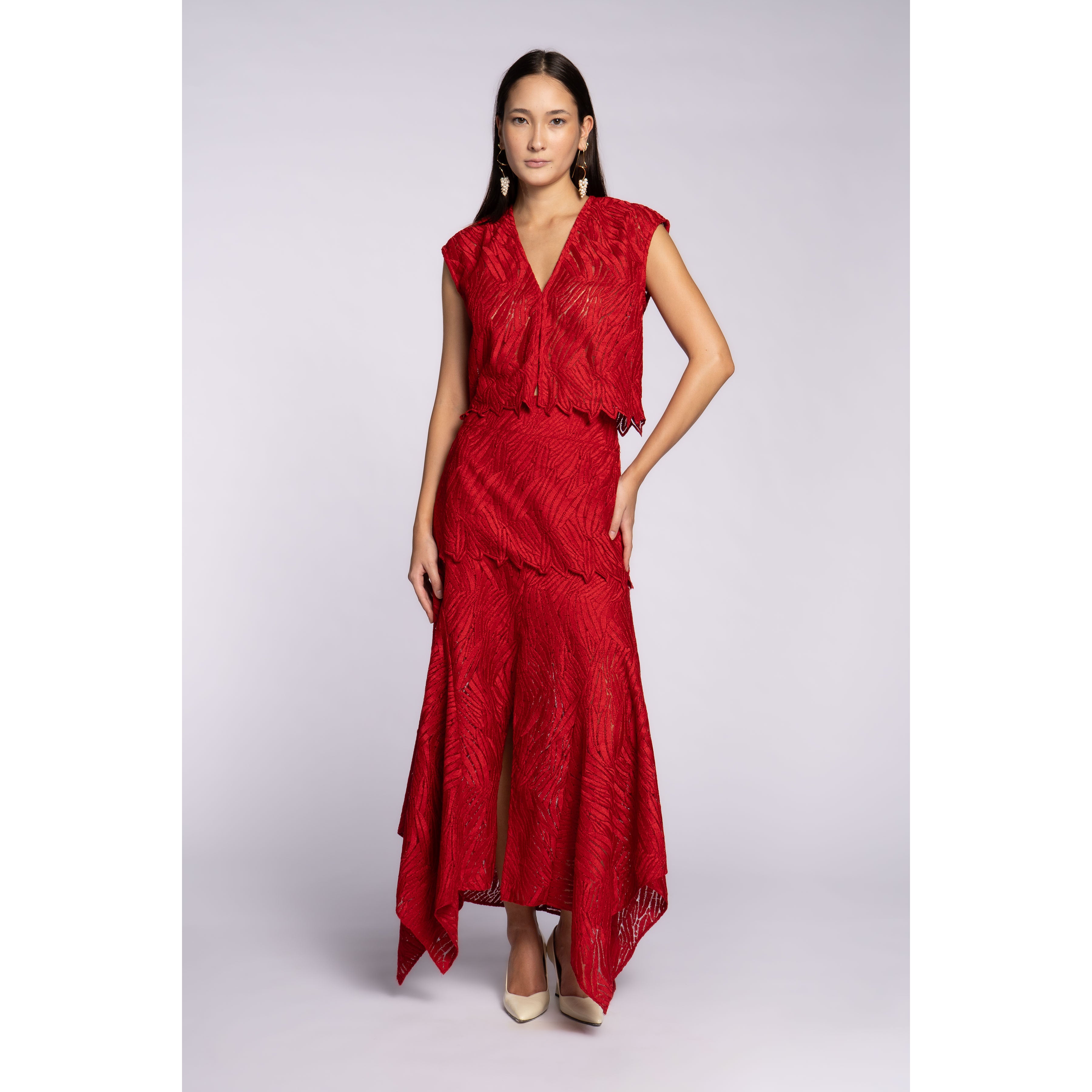 Blusa sem manga em tecido de tule bordado. Possui comprimento levemente cropped, fechamento frontal.