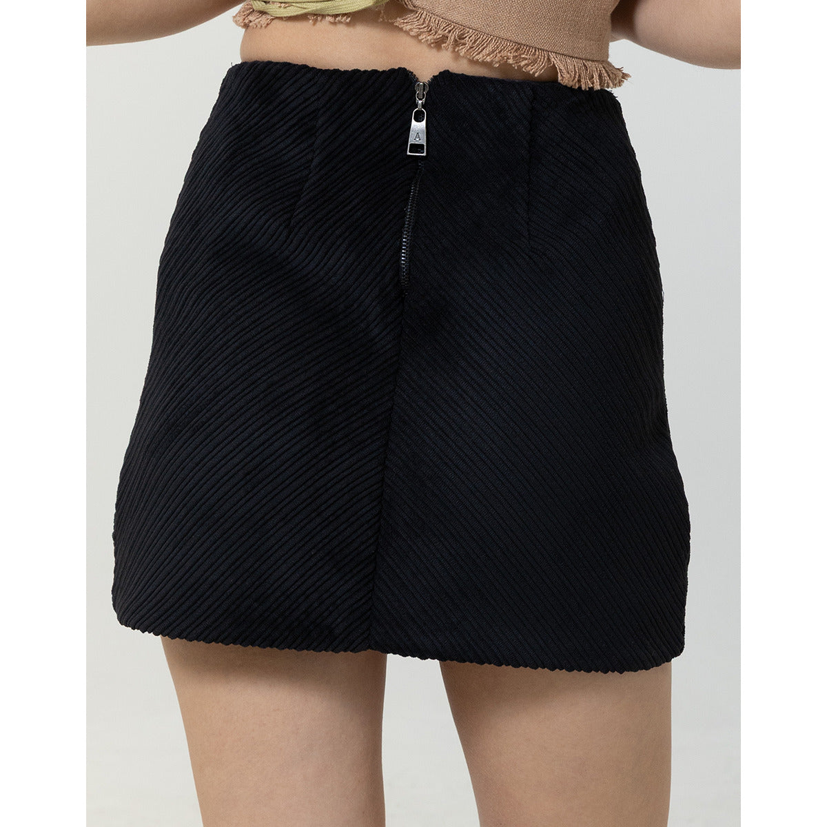 Saia preta Andrea Bogosian confeccionada em tecido canelado em veludo com textura diagonal. Possui modelagem reta, cintura alta e zíper visível nas costas com puxador personalizado da marca. Um modelo minimalista, mas com acabamento sofisticado e moderno. Ideal para compor looks elegantes com um toque