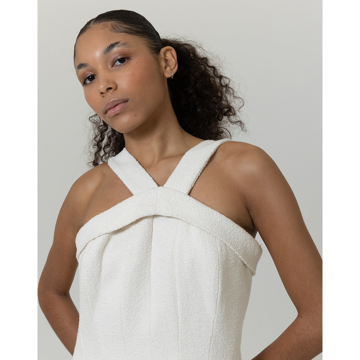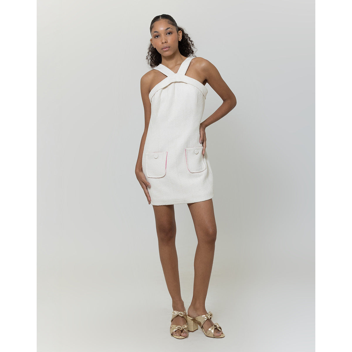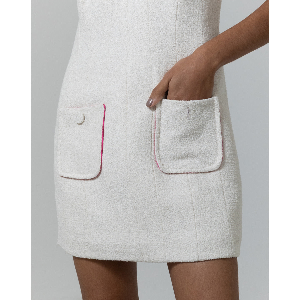 Vestido curto da marca Andrea Bogosian em tweed off-white. Modelagem reta com alças largas cruzadas na frente e decote reto. Possui bolsos frontais aplicados com lapela e detalhe em viés rosa. Costas com recorte central e zíper visível.